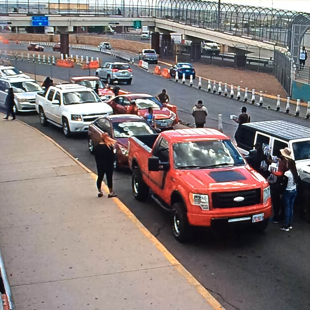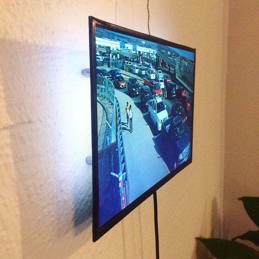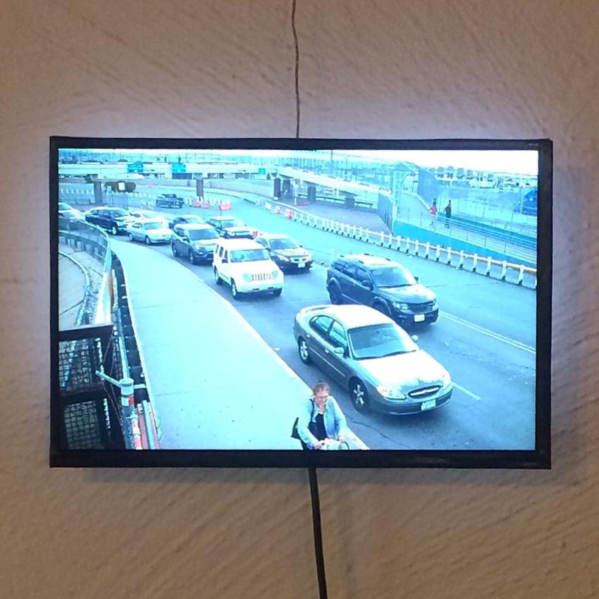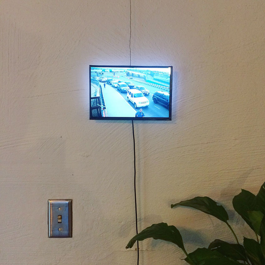 A custom-built video screen which displays live video feed of the Ysleta-Zaragoza International bridge border crossing in El Paso, Texas.