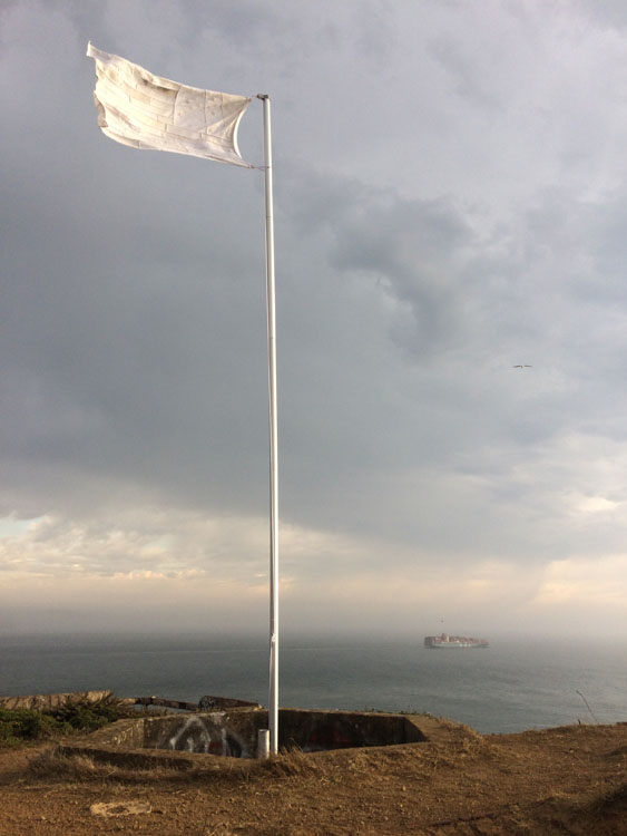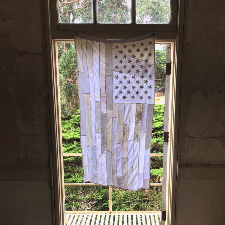 Collected white cotton rags (36 x 60 inches) American flag sewn at Headlands Center of the Arts from collected white, cotton rags. Flag was then flown from military ruins at the Marin Headlands site.