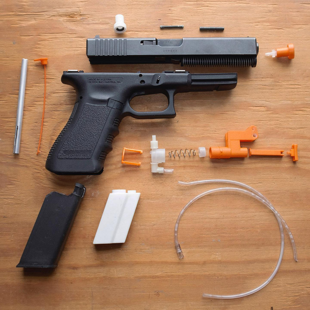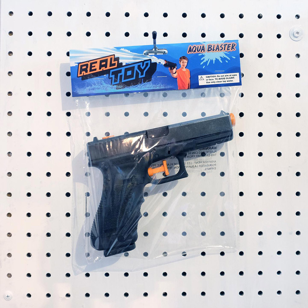 handgun, plastic parts, packaging. (approx. dimensions 8 x 10 x 2 inches) A functional water pistol made from a modified Glock 19 handgun. Making this project required registering for a state handgun permit.